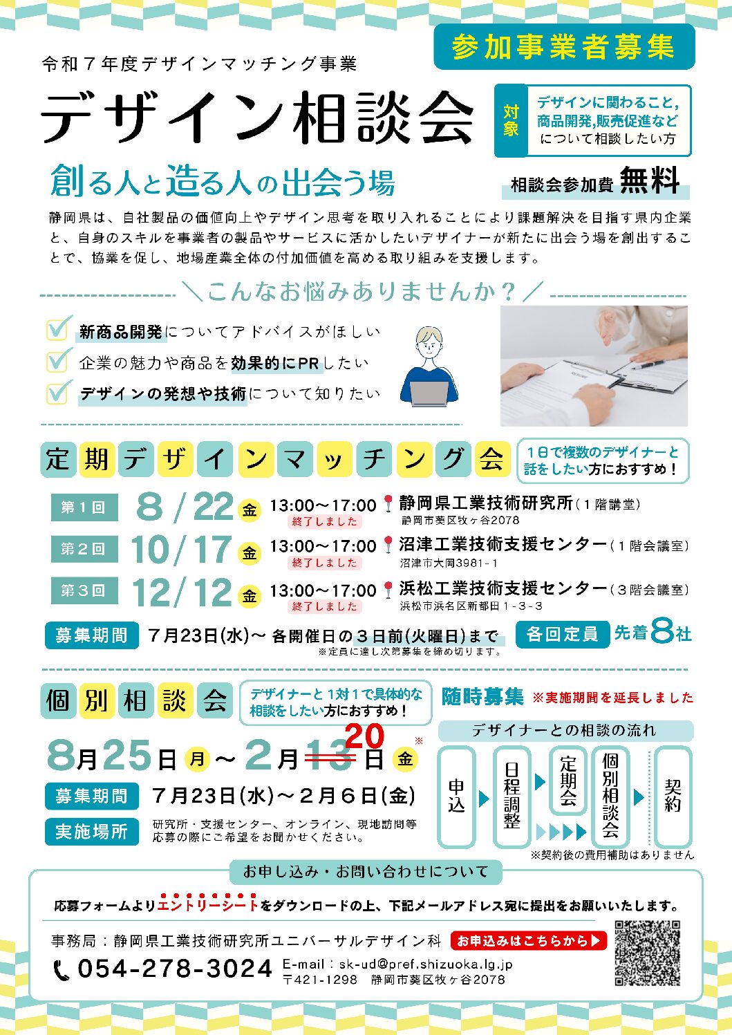 静岡県工業技術研究所が、デザイナーと企業・団体・個人事業主(以下「事業者」という)の交流イベント「定期デザインマッチング会」及び県内事業者と1対1でデザインに関する課題などについて話し合う「個別相談会」を開催します。つきましては、この交流イベントに参加する事業者を募集いたします。