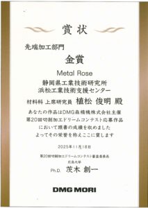 浜松工業技術支援センターで、浜名湖花博2024に展示したアルミ製のバラを「第20回(2025年)切削加工ドリームコンテスト」(DMG森精機株式会社主催)に出展したところ、先端加工部門金賞を受賞しました。